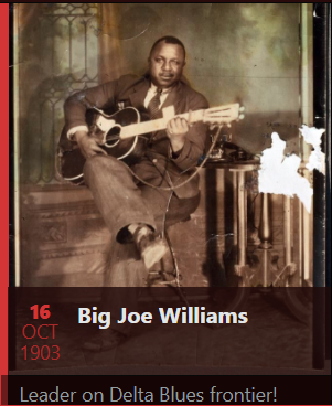 Yes, Led Zeppelin paid homage to Memphis Minnie years later! Big Joe Williams was born in 1903 and is a Delta Blues hero.