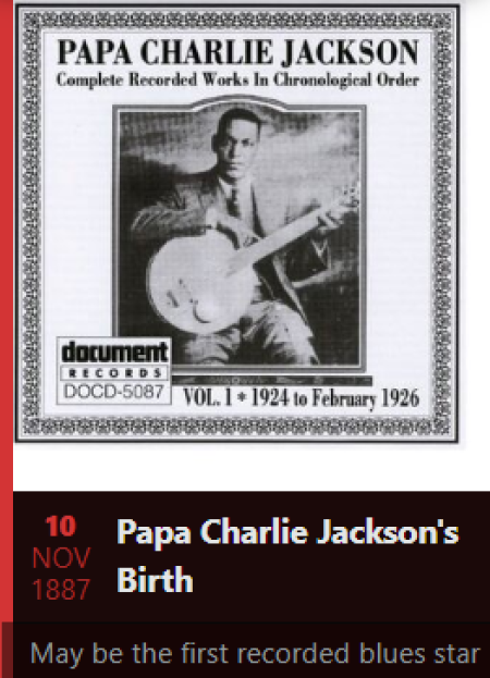 Papa Charlie Jackson (or Baby Franklin Seals, above) was the first recorded bluesman here in America (U.S.)